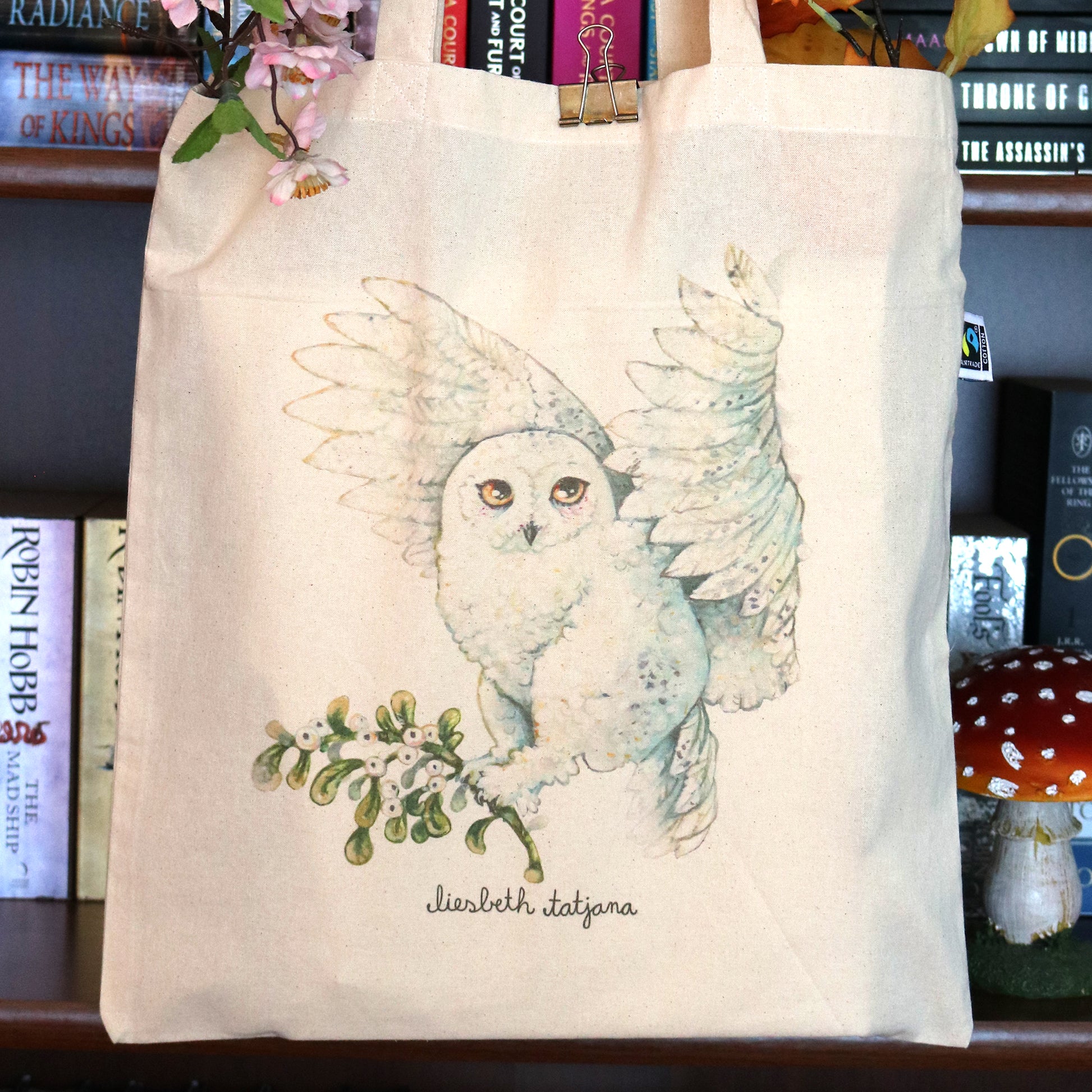A snow owl carrying a mistletoe, a perfect tote bag for your holiday shopping!